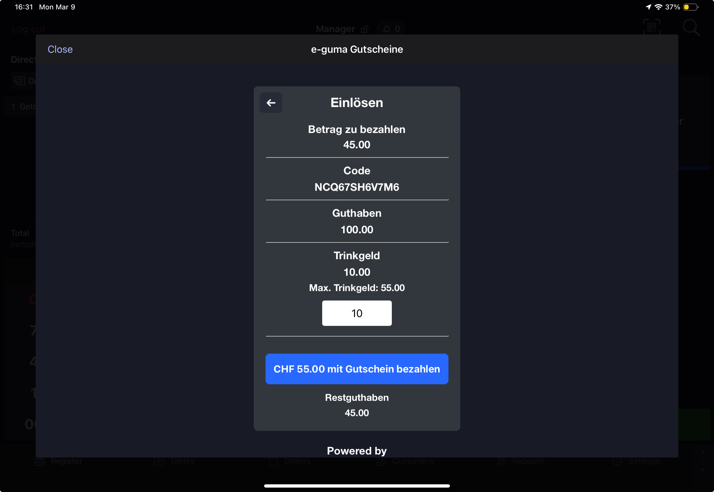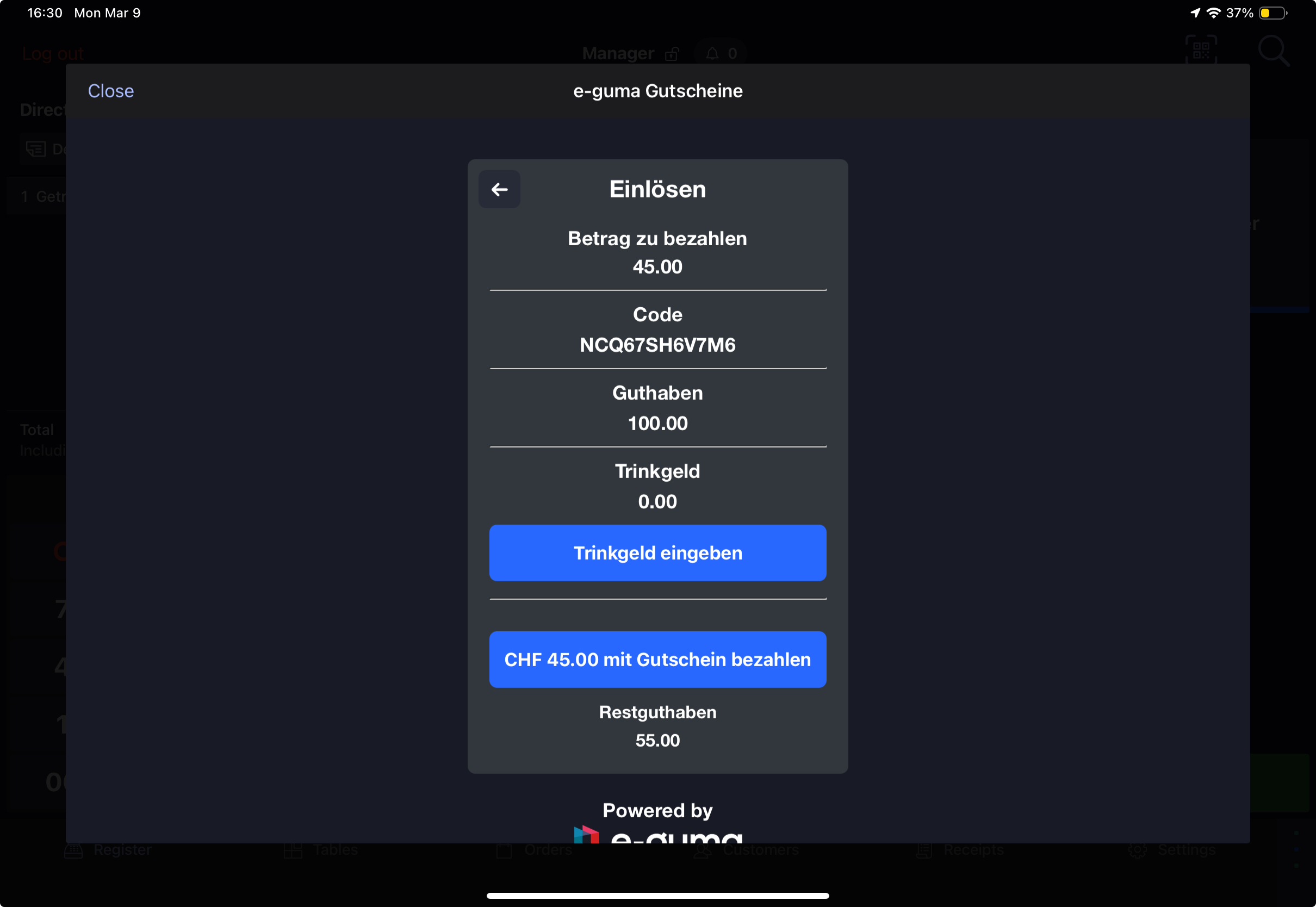 En bas, le solde restant du bon est calculé et affiché. Si vous souhaitez ensuite utiliser d’autres bons, vous pouvez rouvrir la fenêtre e-guma.
