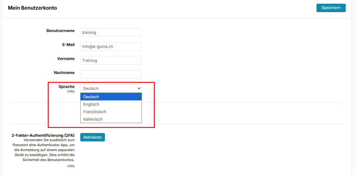 Si la fonction Sélectionner la langue au niveau de l’utilisateur est activée, vos collaborateurs peuvent adapter la langue de manière autonome sous Mon utilisateur.