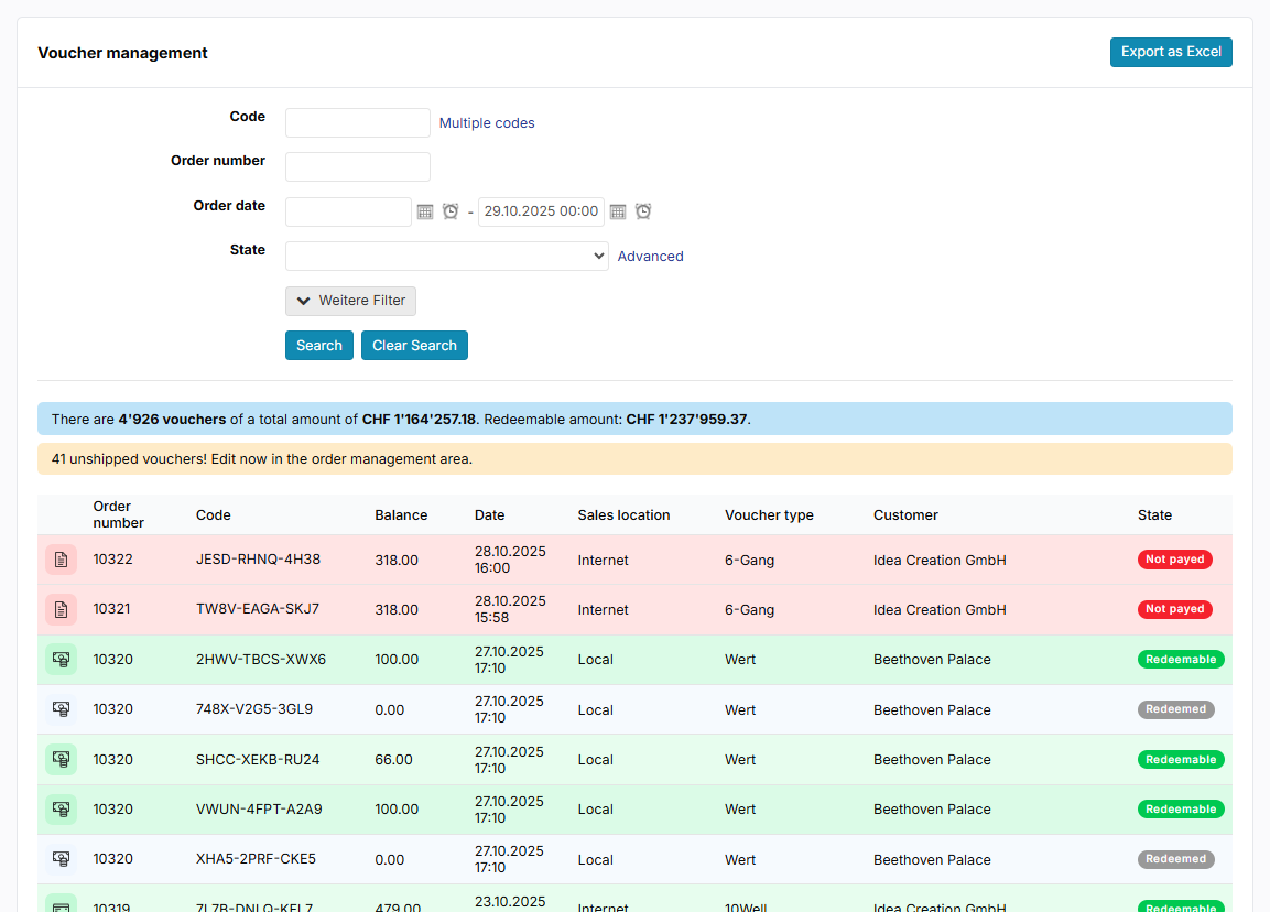 En haut à gauche, le bouton Exporter au Excel vous permet d'exporter tous les bons cadeaux. Découvre ici comment exporter pour Excel, uniquement les bons cadeaux de votre choix à partir de la gestion des bons.