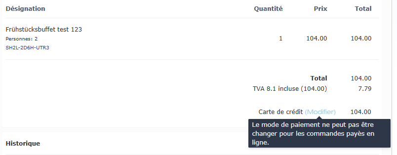 Les paiements avec la carte de crédit dans la boutique en ligne sont effectués en temps réel. C'est pourquoi il n'est pas possible de modifier la méthode de paiement des bons commandés dans la boutique en ligne.