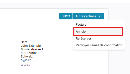 - Lorsque vous annulez des billets, vous avez la possibilité d'envoyer automatiquement une confirmation d'annulation par e-mail au client. Cette option ne s'affiche que si une adresse e-mail a également été enregistrée lors de la commande. Si vous effectuez une annulation partielle, les tickets valables restants se trouvent en annexe de la confirmation d'annulation. De même qu'un reçu ou une facture mis à jour.